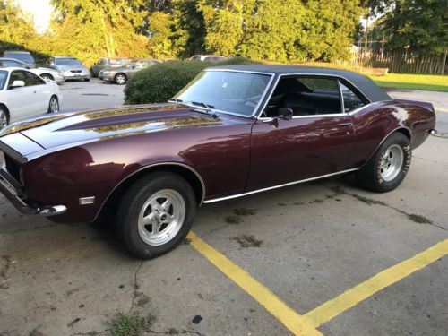 Very nice 1968 Camaro up for auction. Very nice new Marlboro Maroon paint with black vinyl top and original black standard interior in unbelievable condition. Only interior flaw is a tear in the carpet so it includes a new set of