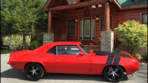 1969 Chevrolet Camaro; built 350 (355); T56 six speed manual transmission; 411 positive traction rear end; modern paint scheme (viper red with matte black detail and black interior); new vintage air; HID LED headlights; driver car