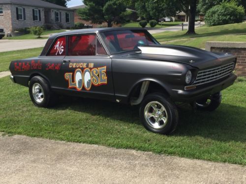 1963 Chevy11 Nova Gasser, 355 chevy engine 350 turbo trans., 3000 stall, speedway straight axle, ford 9” rearend with 410 gear and spoil, 4 link and coil overs, 4 wheel Willwood brakes, brand new wheels and tires, frontend is Fi