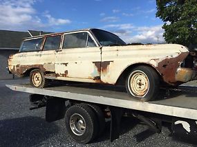 HERE WE HAVE A VERY ROUGH BUT RARE 1965 2-DOOR FALCON WAGON THE WAGON IS FAIRLY COMPLETE MISSING WHAT WAS A RUSTY HOOD AND GRILLE. DRIVETRAIN IS INTACT INTERIOR INTACT BUT ROUGH. REAR WINDOW BROKE OUT VEHICE WAS SITTING ON FARM F