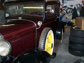 1931 Ford model A two door sedan Victroria 4 cyl spare tire in front fender well.New tires Body excellent paint fair chrome good older restoration so does have some small defects and needs headliner.Runs and drives good black and
