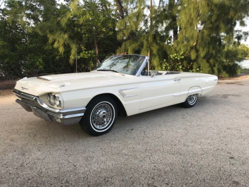 1965 Ford Thunderbird Convertible. Factory Wimbledon white car with black bucket seat interior. 390 4bbl V8 engine with automatic transmission and dual exhaust. Power windows, tilt away steering wheel, power driver's seat, AM/FM