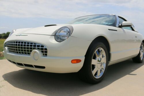 This 2002 Ford Thunderbird is whisper white with black leather and is powered by a 3.9-liter V8 paired with a five-speed automatic transmission. Equipment includes a black convertible top, a body-colored removable hardtop, chrome