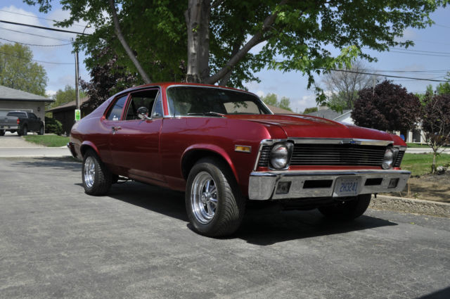 1974 Nova frame with 1969 metal (Front Fenders, Cowl Induction Hood, Grill, Bumpers, Doors and Rear Tail Panel)350, 4 Bolt SmallBlock stroked to 383, estimated 425 to 450HP 10.5 to 1 compression (runs on 91 octane) Less than 100 h