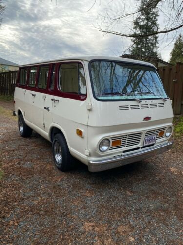 1969 Chevrolet G10 van, 90” display model, windows on one side only w/ popouts in side doors. 75K showing, actual unknown. 250 6 cyl, 3 spd, new two tone paint, white w/ heavy red metallic, resprayed inside as well. All glass an