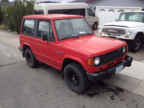 1988 Red Dodge Raider 4x4 SUV (Jeep style) 2.6 4-cylinder engine with a 5-speed transmission and 4-wheel drive (high/low) Limited slip rear axle. Has power steering, power brakes and power windows. Has A/C and it works very well (