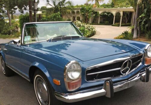 1971 Mercedes-Benz 280 SL in light blue with ivory leather interior, matching hard top and tan canvas soft top. Equipped with an automatic transmission, factory air conditioning, twin side mirrors, restored woodwork, AM/FM origina